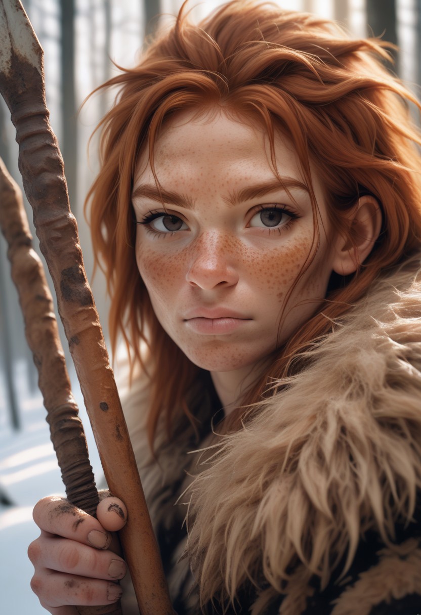 A professional portrait photo of a beautiful gentle strong neanderthal woman in the forest in winter holding a spear, freckles and mud on face, black stripe painted side to side across her eyes, ginger hair and fur, extremely high fidelity, natural lighting, neanderthal woman
