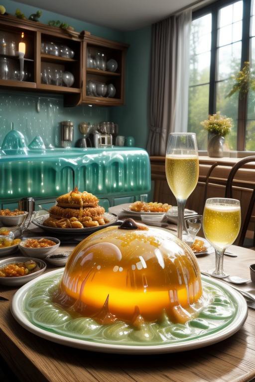 slime-morph, sl1m3d, diner made of slime, diner table, extreme detailed, table focus, champagne, candles.