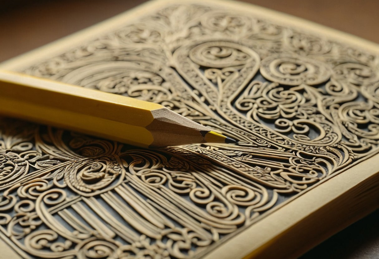 portrait, masterpiece, 4k, ray tracing, intricate details, highly-detailed, hyper-realistic, 8k RAW Editorial Photo. a miniature pencil-totem-pole carved out of a yellow standard no2 pencil, an intricate and highly detailed sculpture carved into the body of a standard pencil. resting on a book, the carvings depict miniature human figures engaged in various activities, as well as ornate architectural and decorative elements, remarkable craftsmanship. cinematic light, dramatic light, shallow depth of field, high budget, bokeh, cinemascope, film grain,