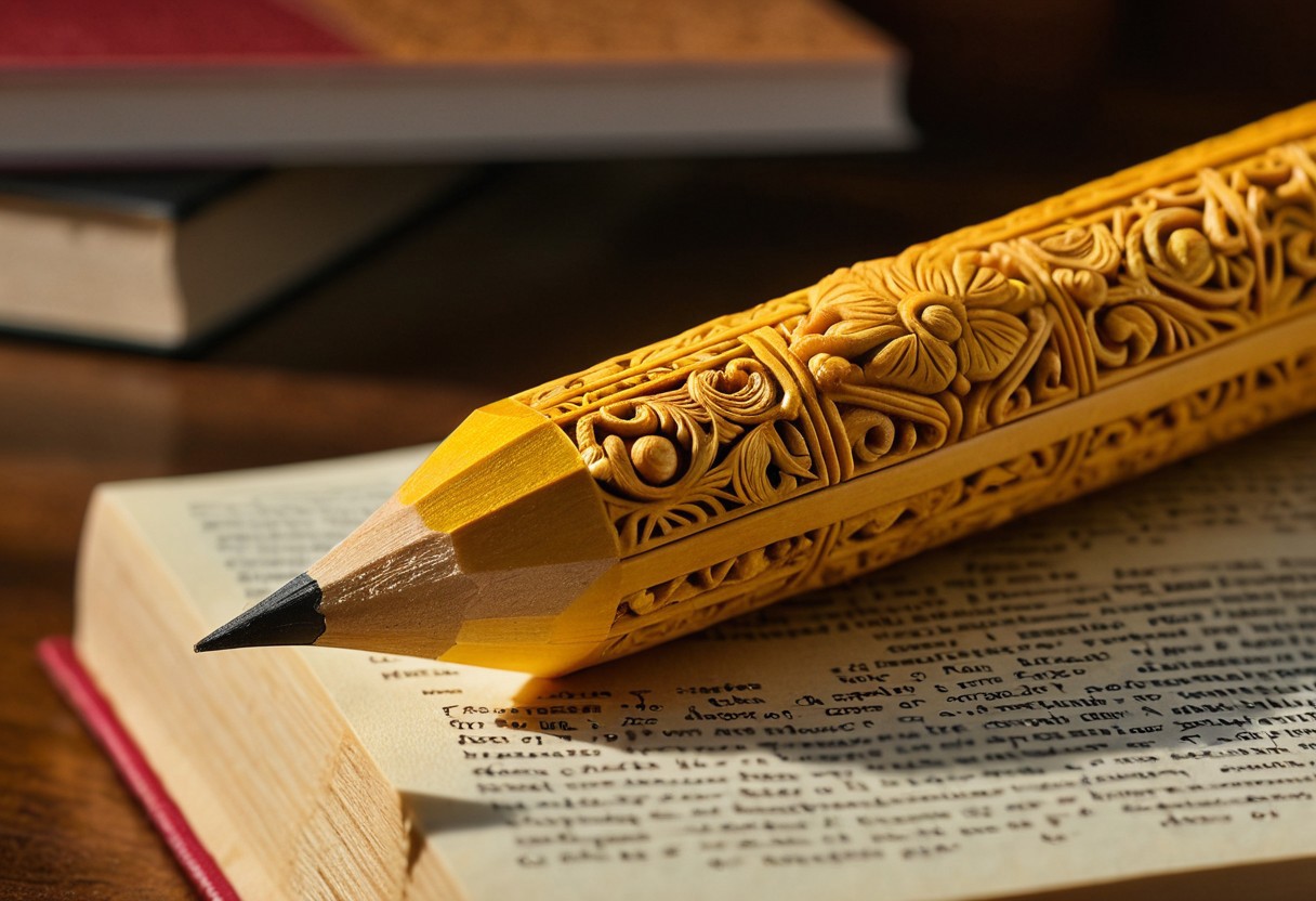 portrait, masterpiece, 4k, ray tracing, intricate details, highly-detailed, hyper-realistic, 8k RAW Editorial Photo. a miniature pencil-totem-pole carved out of a yellow standard no2 pencil, an intricate and highly detailed sculpture carved into the body of a standard pencil. resting on a book, the carvings depict miniature human figures engaged in various activities, as well as ornate architectural and decorative elements, remarkable craftsmanship. cinematic light, dramatic light, shallow depth of field, high budget, bokeh, cinemascope, film grain,