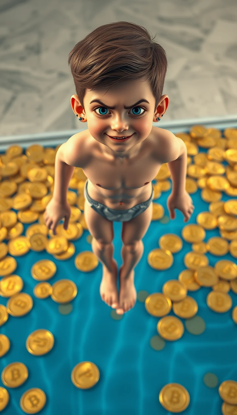 A mini-clone, the real-life "Vitalik Buterin", with a flattering appearance and a sarcastic smile at the corner of his mouth, watchful eyes and a piercing in his ear. He is standing on a diving board and is about to dive into a pool full of Bitcoin coins. Thousands of "Etherium and BTC" coins are scattered on the edge of the pool. He is in a diving position. He is barefoot and wearing swimming trunks. Highly defined 3D image.