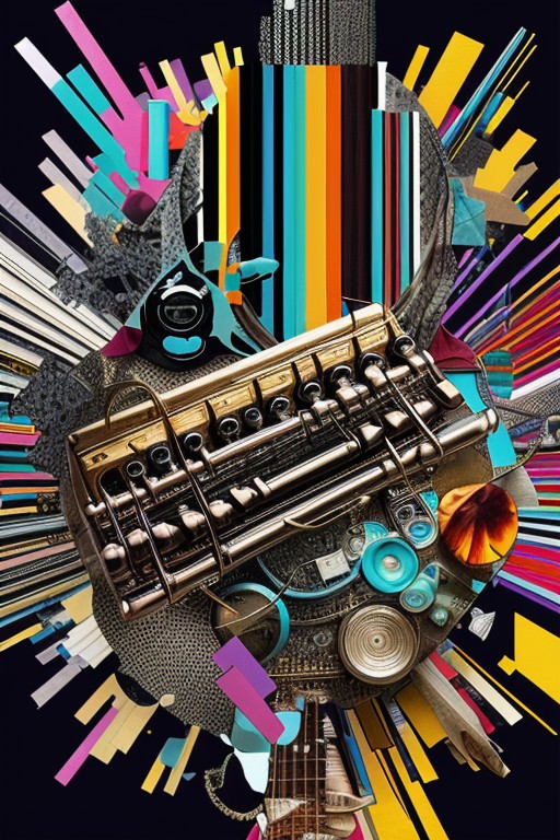 Create a striking abstract collage using vibrant cutout images of musical instruments. Blend them together in an unusual way with glitch effects.