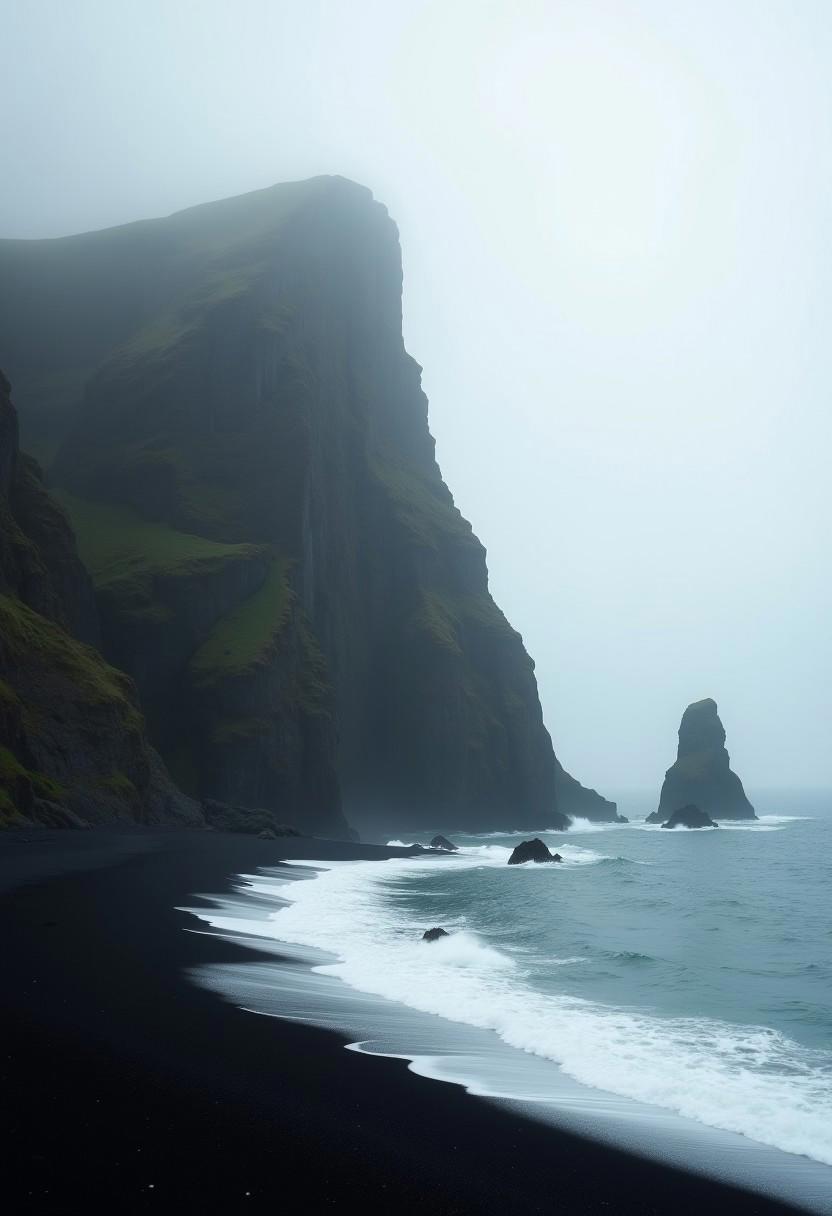 Michael Shainblum, , huge silhouetted cliff above dark oceans, deep valley,huge waterfall,heaven,black beach, white atmosphere, minimalism, vigentte effect. log exposure photography