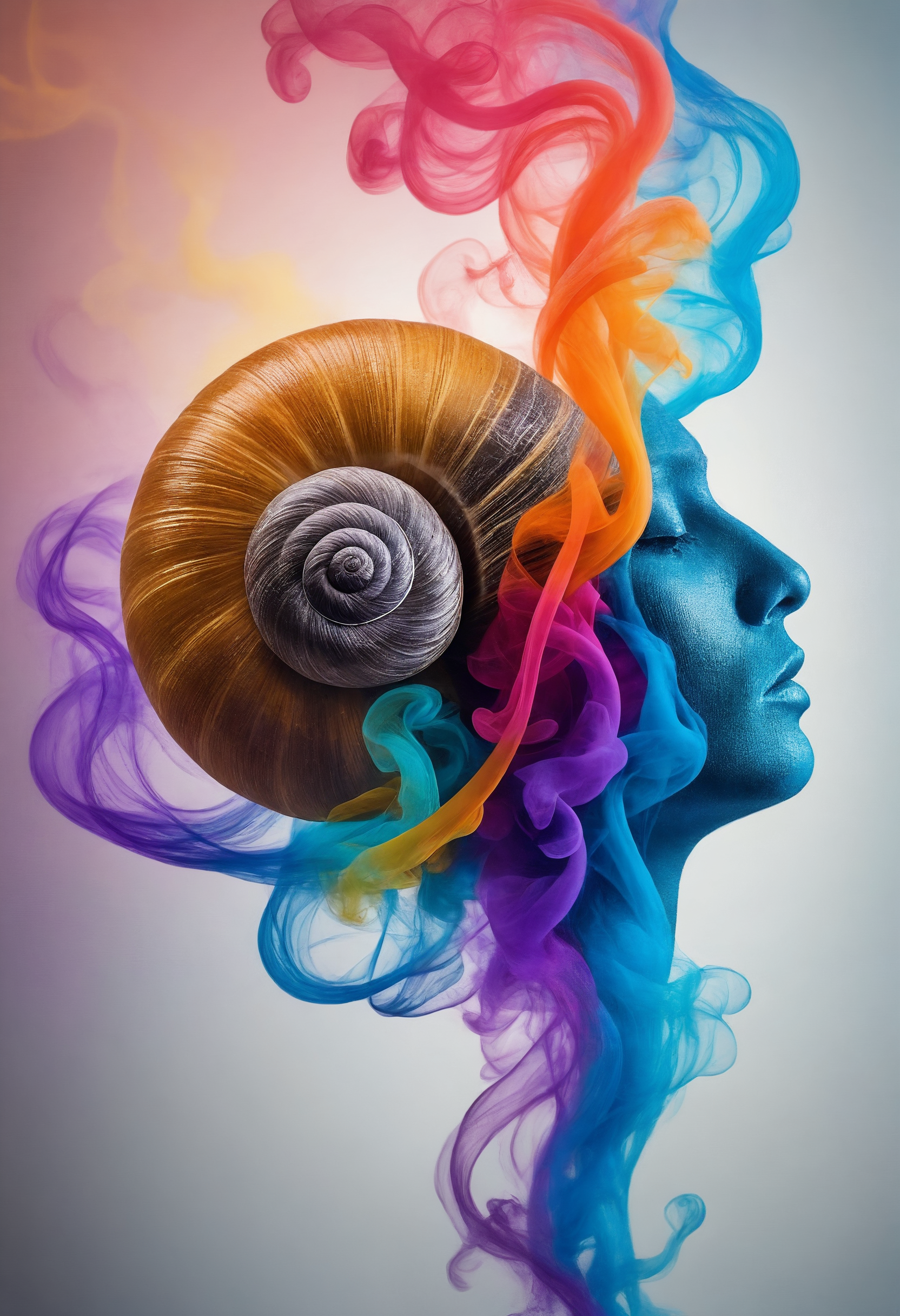 a snail head profile transforming into colorful swirling smoke. Artistic composition, abstract background, high-resolution art,