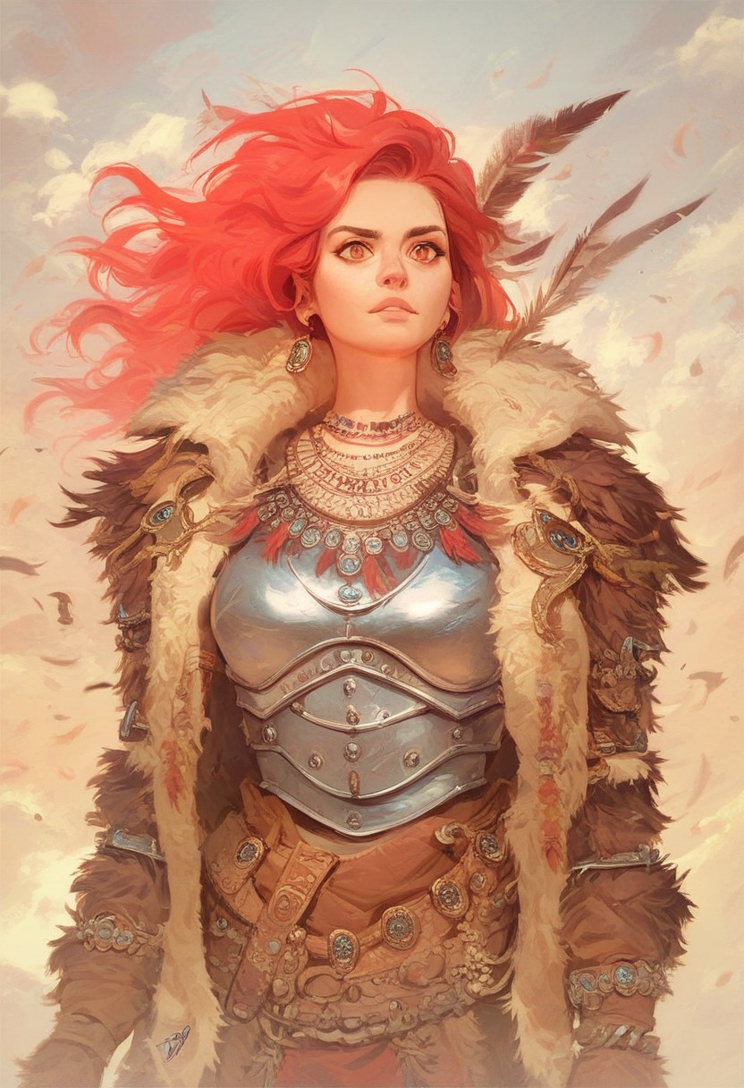 score_9, score_8_up, score_7_up, masterpiece, best quality, newest, absurdres, highres, 1girl, HellionDD-Il.V1.0, jewelry, necklace, red hair, armor, leather armor, fur coat, red hair, tribal, clevage,