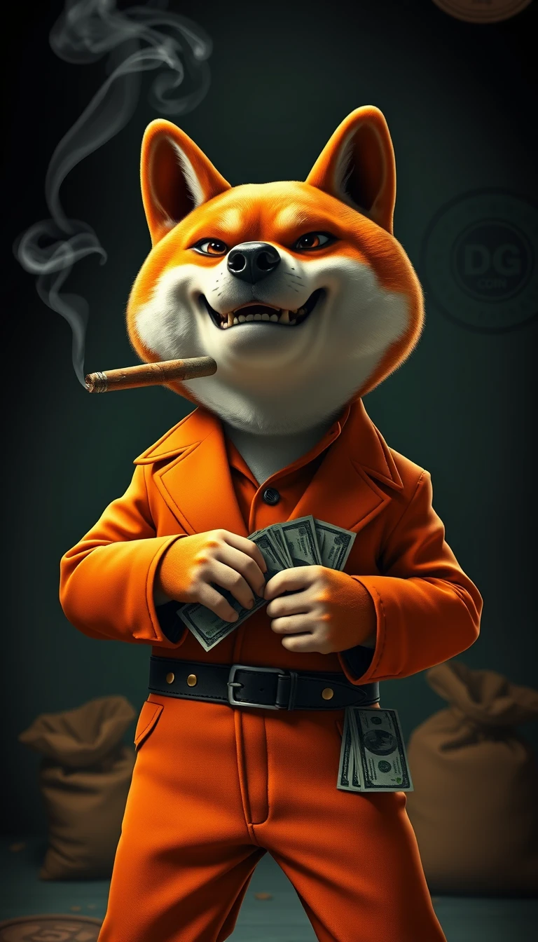 "A striking and intense image of a Shiba standing confidently, embodying the persona of a ruthless loan shark and mafia boss. He is dressed in a stylish orange jumpsuit, with a bold orange jacket adding a surreal yet darkly comic touch. His stance is commanding, with one hand holding a thick, smoking cigar and the other holding a stack of dollars. His expression is fierce, with a scowl, furrowed brows and a piercing gaze that exudes menace and power. The background is a shadowy, dimly lit space with subtle details, such as faint silhouettes of bags of money, with the "DOG Coin" logo creating an atmosphere of danger and underhanded dealings. Smoky tendrils of the cigar swirl in the darkened environment, adding depth and drama to the scene. Disney Pixar movie style.