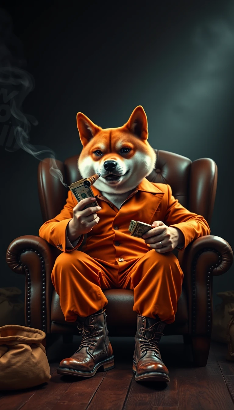 A striking and intense image of a Shiba sitting in a leather armchair. Confidently, he looks like a ruthless loan shark and mafia boss. He is dressed in a stylish orange jumpsuit, with a bold orange jacket adding a surreal yet darkly comic touch. He wears brown fashion boots. He is in a commanding stance, with one hand holding a thick, smoking cigar, in the other holding a stack of dollars tightly. His expression is fierce, with furrowed brows and a piercing gaze that exudes menace and power. The background is a dark, poorly lit space with subtle details and a beam of dim light, faint silhouettes of bags of money, with the "DOG Coin" logo, creating an atmosphere of danger and underhanded dealings. Smoky tendrils of the cigar swirl in the darkened space, adding depth and drama to the scene. Disney Pixar style.