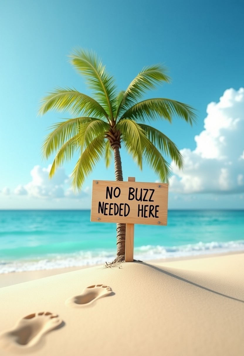 Realistic, photograph, A tiny island with a single palm tree, where a wooden sign stuck in the sand reads ‘NO BUZZ NEEDED HERE’ with fresh footprints leading away.