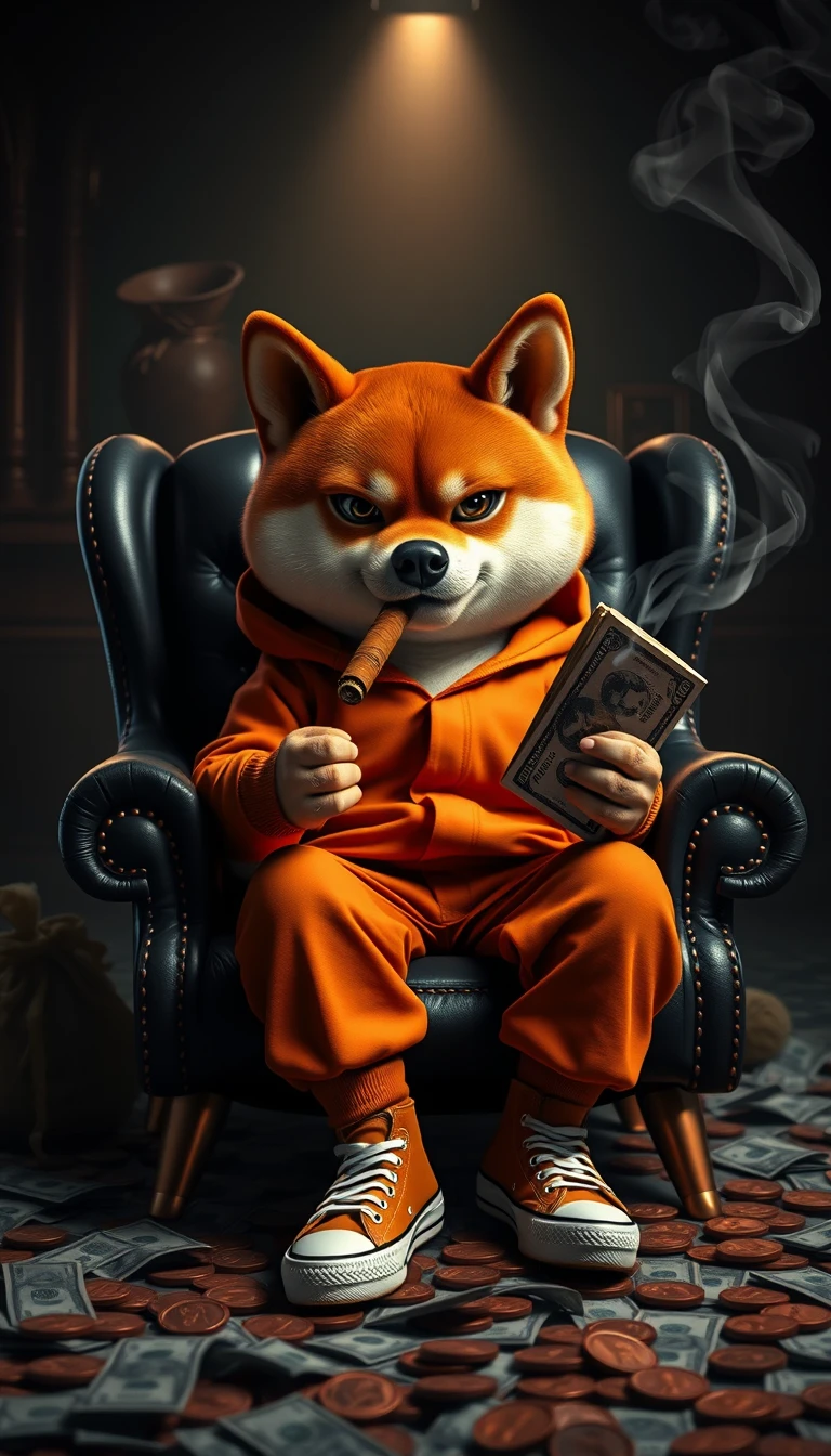 A striking and intense image of a miniature Shiba sitting in a black leather armchair with copper accents. Confidently, he looks like a ruthless loan shark and mafia boss. He is dressed in an orange jumpsuit, with a bold orange hooded jacket, adding a surreal yet darkly comic touch. He wears trendy Converse sneakers. In one hand he holds a thick, smoking cigar, in the other he holds tightly a stack of dollars. His expression is furrowed brows and a piercing gaze that exudes menace and power. The background is a dark, poorly lit space with subtle details and a dim light beam, faint silhouettes of money bags with the "DOG Coin" logo. Thousands of dollar bills and coins are scattered across the floor, creating an atmosphere of danger and underhanded dealings. Smoky tendrils of the cigar swirl in the dark environment, adding depth and drama to the scene. Disney Pixar style.