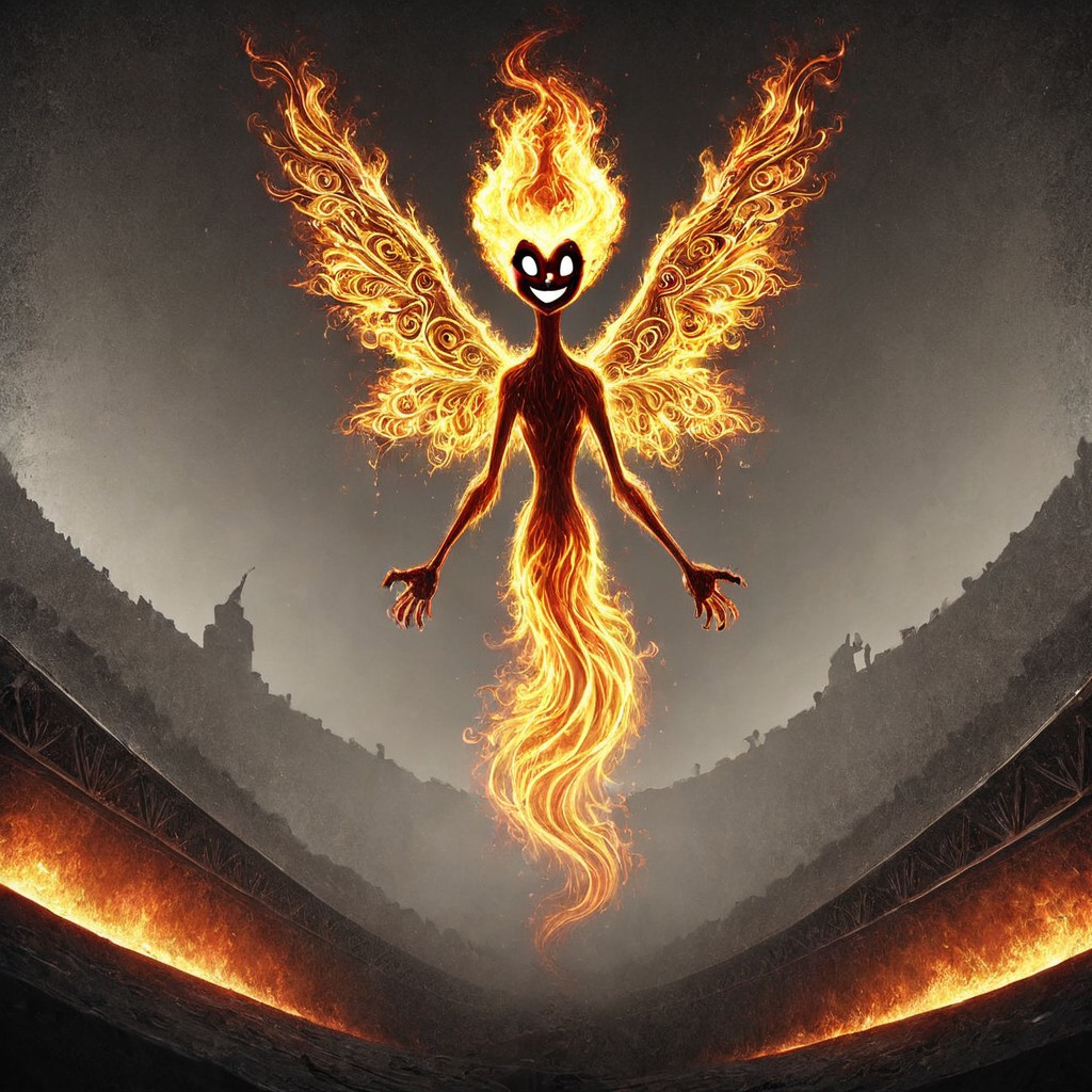 dimly lit tunnel, eerie red glow reflecting off the wet walls, an old, abandoned train with a polished, shiny surface standing motionless on the tracks, a celestial mouse angel with tattered wings of fire (flamestyle) floating above, eyes glowing with mirth, mouth smiling widely, smoke creeping along the ground, atmosphere filled with wimsy. KidsRedmAF, lazynsfw, lazypos