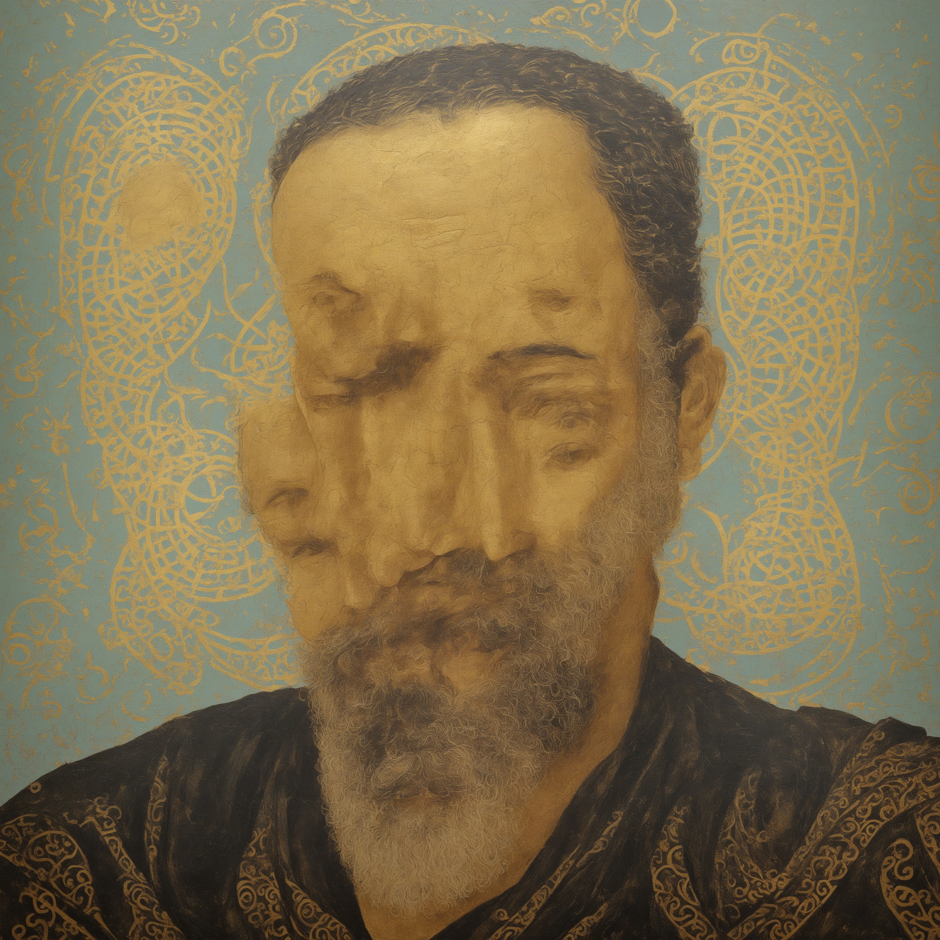 change the image with a great piece of art fayoum portrait with greek golden patterns in the background
