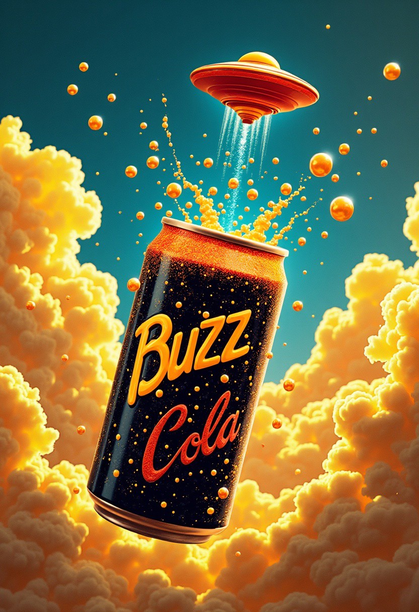 Digital matte painting. Medium shot. A soda can of "BUZZ Cola" with a flying saucer abducting fizzy bubbles. Medium shot. Pop-art style, comic ink sketches, and psychedelic backgrounds like Chris Riddell. Swirling clouds of Yellow and Black. Shiny metallic textures with reflections. Epic, cinematic, brilliant, stunning, intricate, meticulously detailed, dramatic, atmospheric, maximalist. Glow of neon signs in the background. Vivid, bold, and bright colors with a deep blue sky. Triadic colors, gradients, and lens flares.
