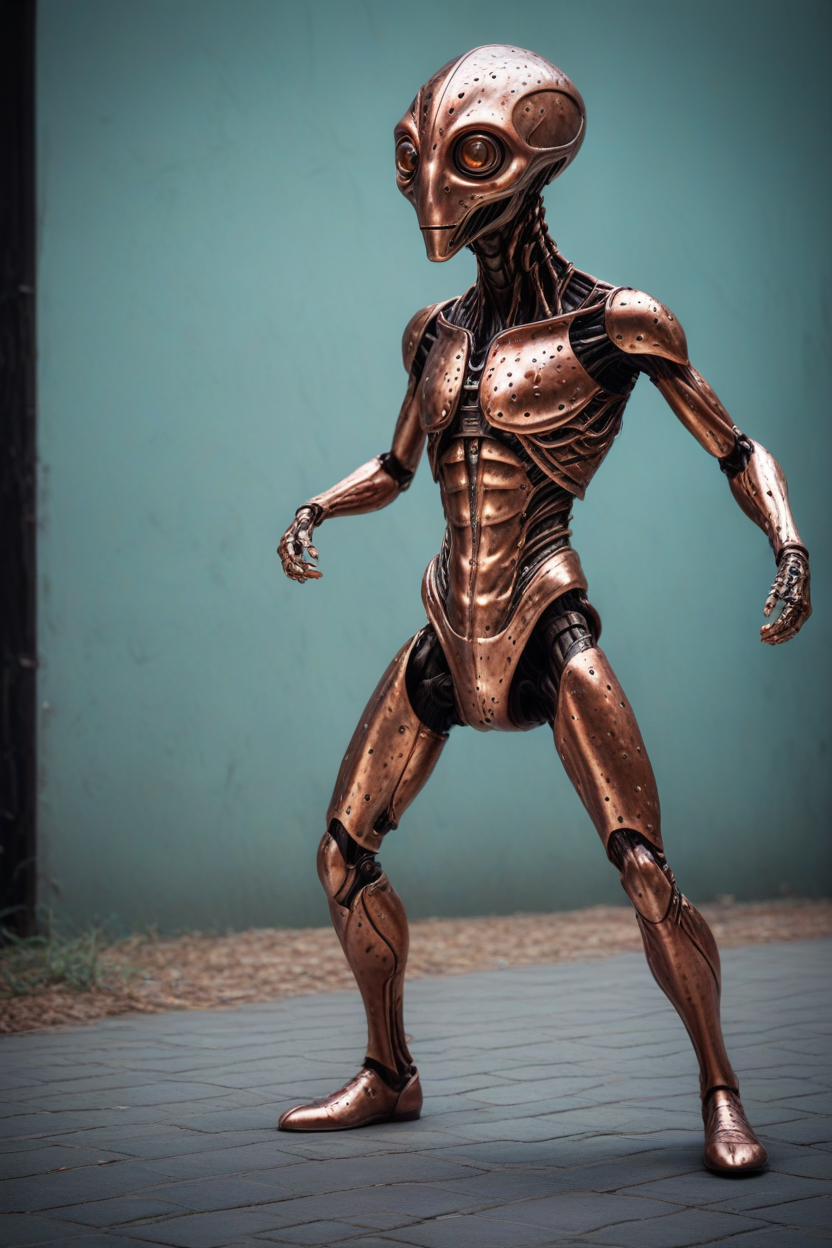 A copper alien, action pose, cinematic photography <lora:MadeOfCopper01_CE_SDXL:1>