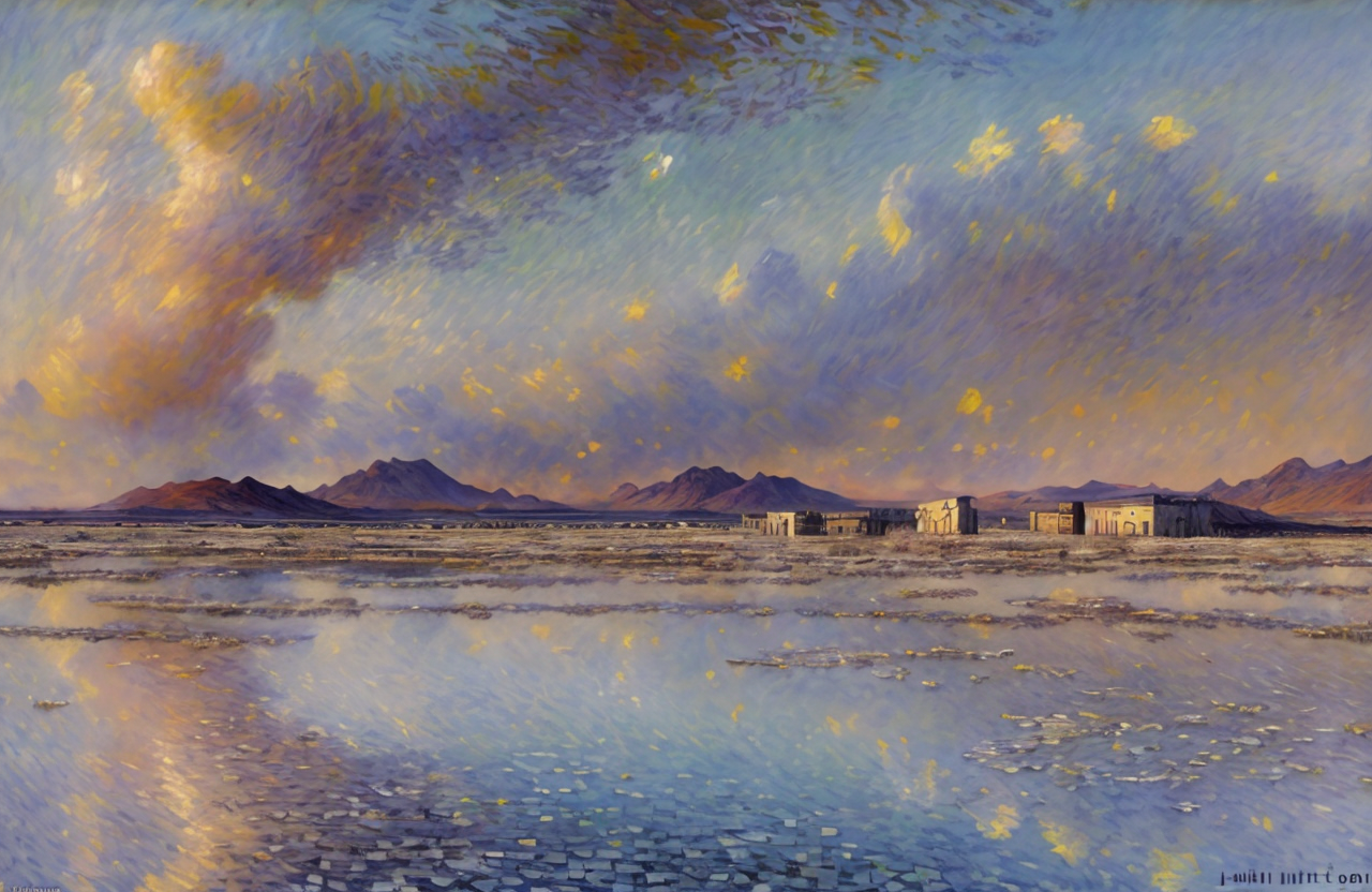 (impressionism:1.1), salt flat, russian panel houses, (john harris:1), rural, scenery,scene painting,a painting, <lora:russian_panel_houses_v105:1>,