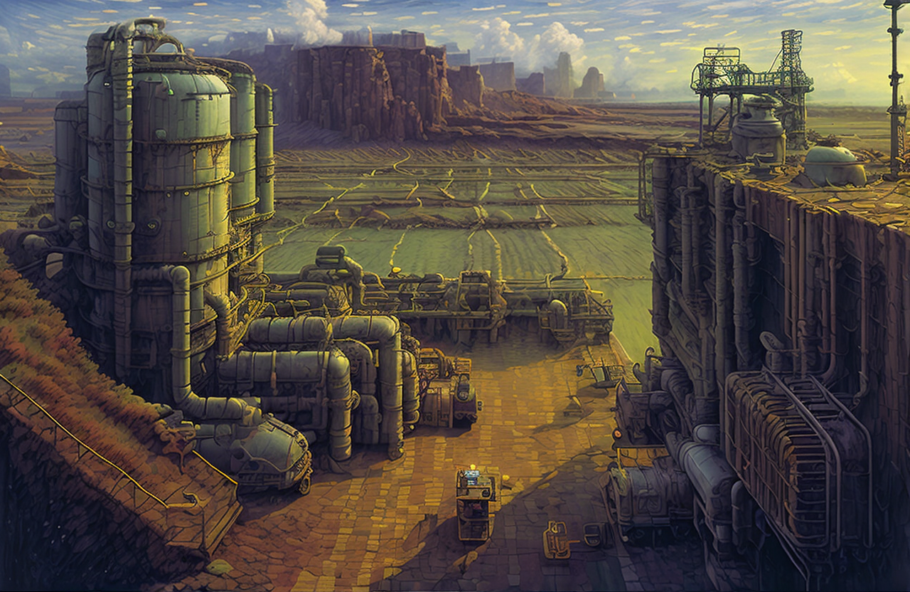 (impressionism:1.15), salt flat, Cliff/Bluff, industrialism, (john harris:1.1), rural, scene painting,a painting,scenery, plant,tree,robot,2d game scene,scenery,night, <lora:å·¥ä¸è¸æ±½:0.7>,