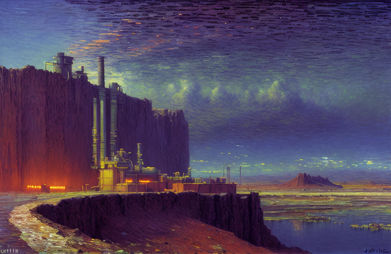 (impressionism:1.15), salt flat, Cliff/Bluff, industrialism, (john harris:1.2), rural, scenery,scene painting,a painting, robot,sky,scenery,industrial pipe,night,no humans, <lora:å·¥ä¸è¸æ±½:0.3>,