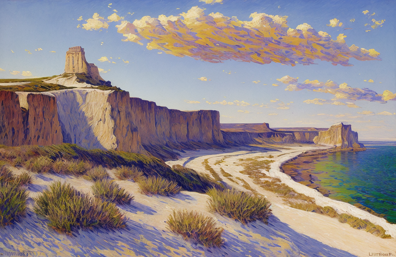 Cliff/Bluff, (impressionism:1.05), salt flat, (Vincent Di Fate:0.7), rural, scene painting,a painting,scenery,