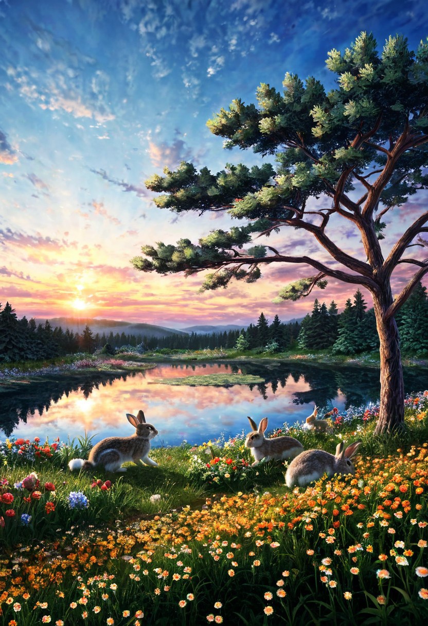 masterpiece, best quality, ultra-detailed, realistic, 8k, pine tree, flowers fields, many kinds of flowers, a couple of rabbits on very distant, lakes, meadows, glitter, afternoon, sunset, out-of-this-world scenery, lifelike, naturalism, greatest naturalism photo, immaculate detailed realism photography, colorful leaves, rich colors, best colors perfect composition, perfect colors, colorful, clear photo, intrigue nature panorama, delicate nature photo, immaculate micro-details nature elements, (out-of-this-world scenery:1.23), beautiful landscape, beautiful flowers, crystal fantastic, breathtaking beautiful nature, unmatched beauty nature, more nature elements, rich nature elements, beach, (awards winning photography:1.37), trending on artstation, real life photo realistic, perfect proportion, aesthetic, artistic style, surreal, insanely lifelike, top best naturalism photography, greatest detailed, intricate nature details background, depth of field, no human, PEAnimeBG, Background, anime, scenery, very detailed, ultra-detailed, hyper detailed