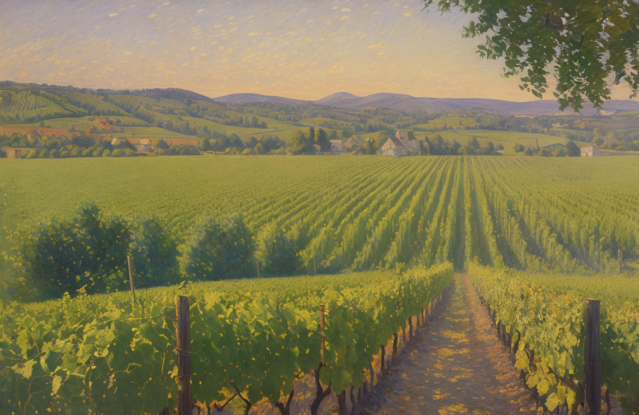(impressionism:1.1), (Vincent Di Fate:0.9), estate ,field ,vineyard , scenery,a painting,scene painting,