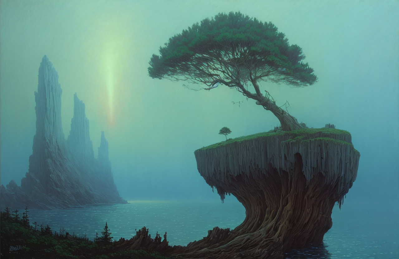 (impressionism:1.05), Bioluminescent fog ,A shipwreck suspended in air ,A tree growing through a skull , Cliff/Bluff, pine forest, (Vincent Di Fate:0.8), a painting,scene painting,scenery,