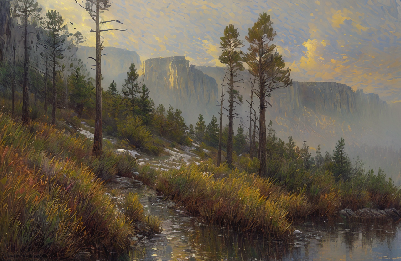 (impressionism:1.15), Cliff/Bluff, pine forest, (jeremy mann:0.8), scenery,scene painting,a painting, salt flat,