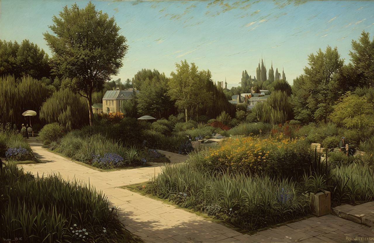 (Vincent Di Fate:1), scenery,a painting,scene painting, clump ,arboretum ,terrace ,