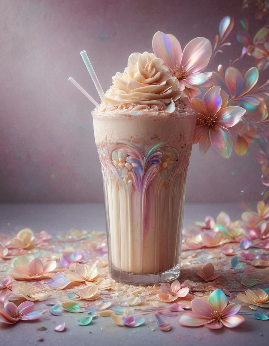 sakura cream milk ice shake frappe, p1nk1r1fl0wers, made out of iridescent flower petals, high quality, masterpiece <lora:PinkieIriFlwrsSDXL:1>