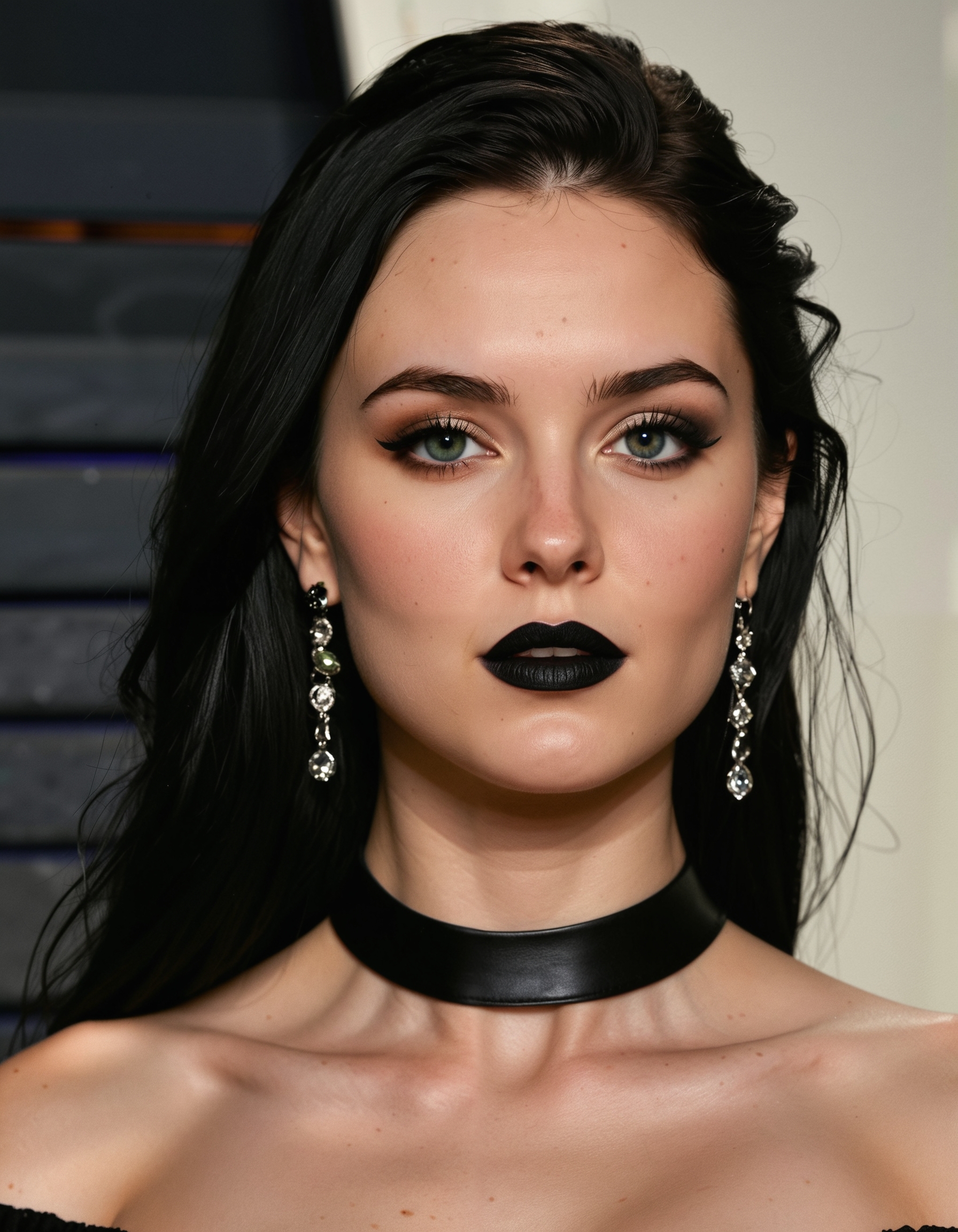 A photo-realistic portrait shoot from a portrait camera angle about a close-up portrait of a young woman with striking features and dark makeup, featuring striking green eyes and dark lipstick. the image also shows a black choker with a pendant and earrings. on the middle of the image, a 20 years old woman appears to be looking at the viewer with a neutral expression, wearing a black off-the-shoulder dress with ruffled edges. she has long black hair and pale skin, and her green eyes are looking directly at the camera. her lips are painted black, and she is wearing black lipstick. her hair is styled in a long hair style and her hair color is black hair. the background is dark and blurry, and the lighting is soft and diffused, creating a moody atmosphere.
