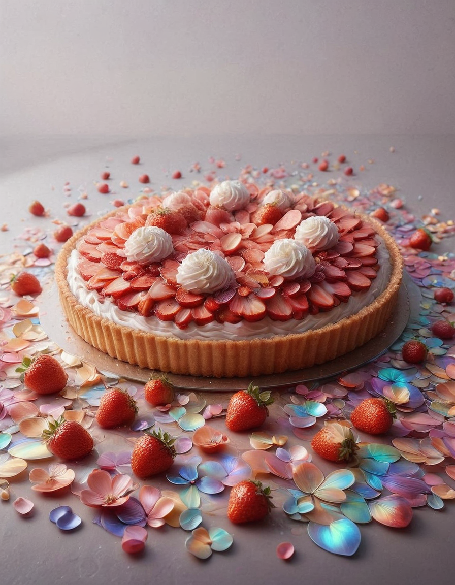 strawberry tart, p1nk1r1fl0wers, made out of iridescent flower petals, high quality, masterpiece <lora:PinkieIriFlwrsSDXL:1>