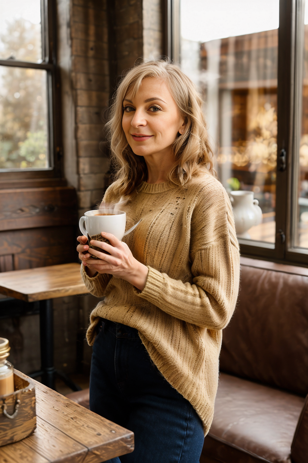 <lora:NinaHartleySD:0.8>, A woman in a cozy vintage café, wearing a sweater and having a steaming cup of coffee. Sunlight streams through large windows, illuminating her serene expression. Rustic furniture, antique decor, shelves with books and jars, soft golden lighting, tranquil atmosphere. RAW photo, soft lighting, 8K UHD, DSLR, film grain, Nikon D850.