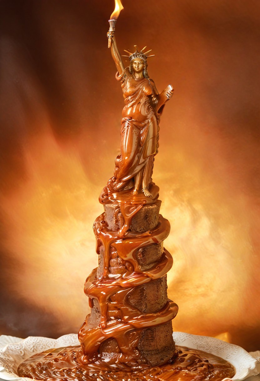 reality-shot, realism, realistic photography of the Statue of Liberty reimagined in caramelized form, torch blazing with molten caramel flames, pedestal wrapped in cascading caramel ribbons, base surrounded by caramelized waves, patriotic art style, burnt-amber theme, intricate details, ultra sharp, exquisite detail, flawless composition, vivid colors, masterpiece, sweet symbolism