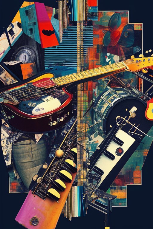 Create a striking abstract collage using vibrant cutout images of musical instruments. Blend them together in an unusual way with glitch effects.