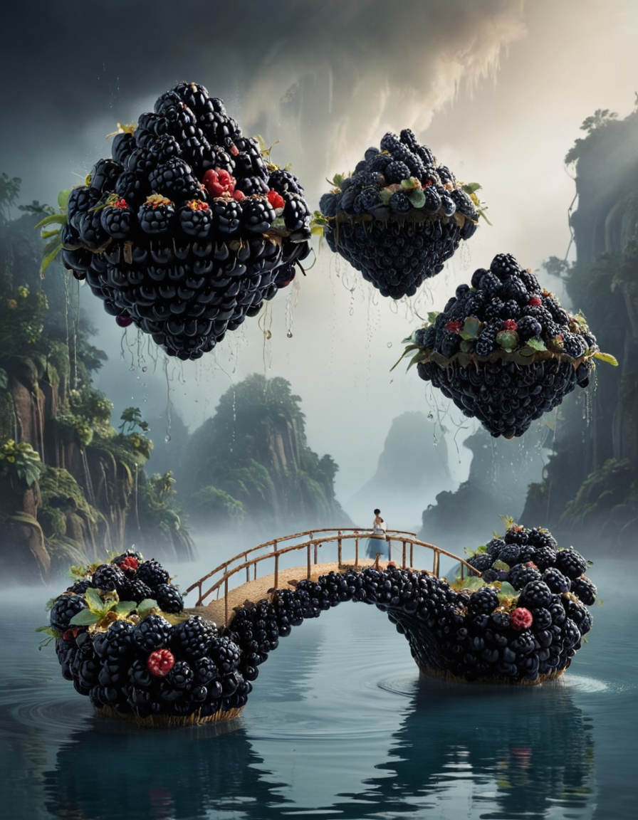 blackberryworld a dreamlike sequence of floating islands connected by ethereal bridges, abstract figures moving between them, a sense of wonder and mystery <lora:Blackberryworld_Morth:1>