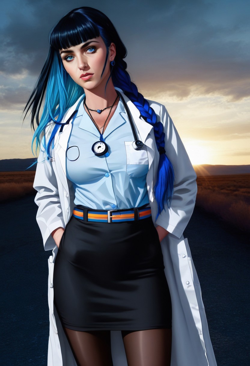 cinematic film still, saturated colors, negative space, 1 adult woman, civitai-chan, braided bangs (breaking bad style), face of Marie Schrader, (solo female focus), labcoat, shirt, shirt tucked in, single vertical stripe, black skirt, pencil skirt, pantyhose, necklace, belt multicolored hair, black hair, blue hair, blue eyes leading lines, backdrop is bluesky_style, gray sky, sunset