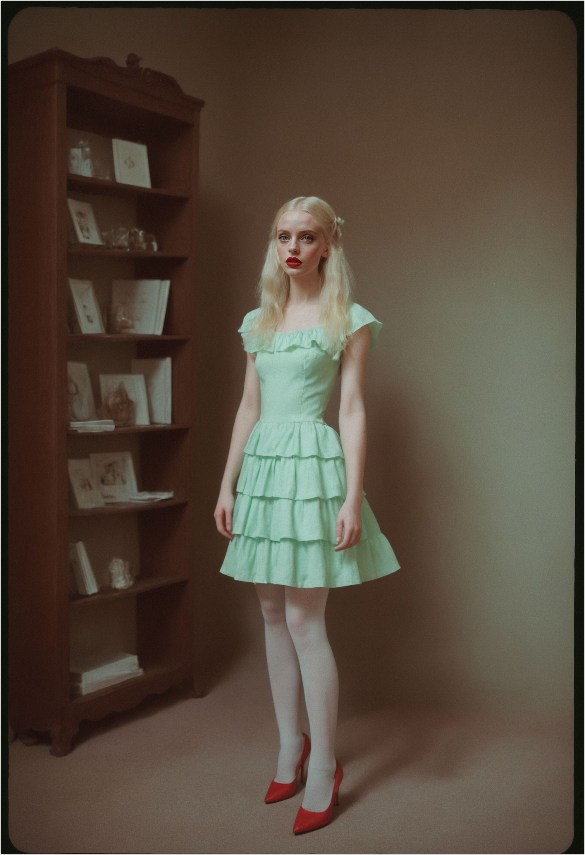 The scene is a dark academia library, bookshelf, indoors. A skinny egirlmakeup 4ng3l face woman stands alone and glowing. The scene is captured on Polaroid and Hasselblad 120mm medium format film, giving it a dreamy, nostalgic quality. The woman, who appears to be around 21 years old, is petite with long legs and porcelain skin. She is dressed in a random outfit and tall high-heel shoes. Her clothes are frilly and feminine, and her long blonde hair cascades down her back in loose waves. Her lips are painted a glossy red, and her eyes are framed by realistic dark mascara. Worried expression. Seafoam-green and pastel-pink colored smoke, <lora:detailed_hands-000007:0.8>