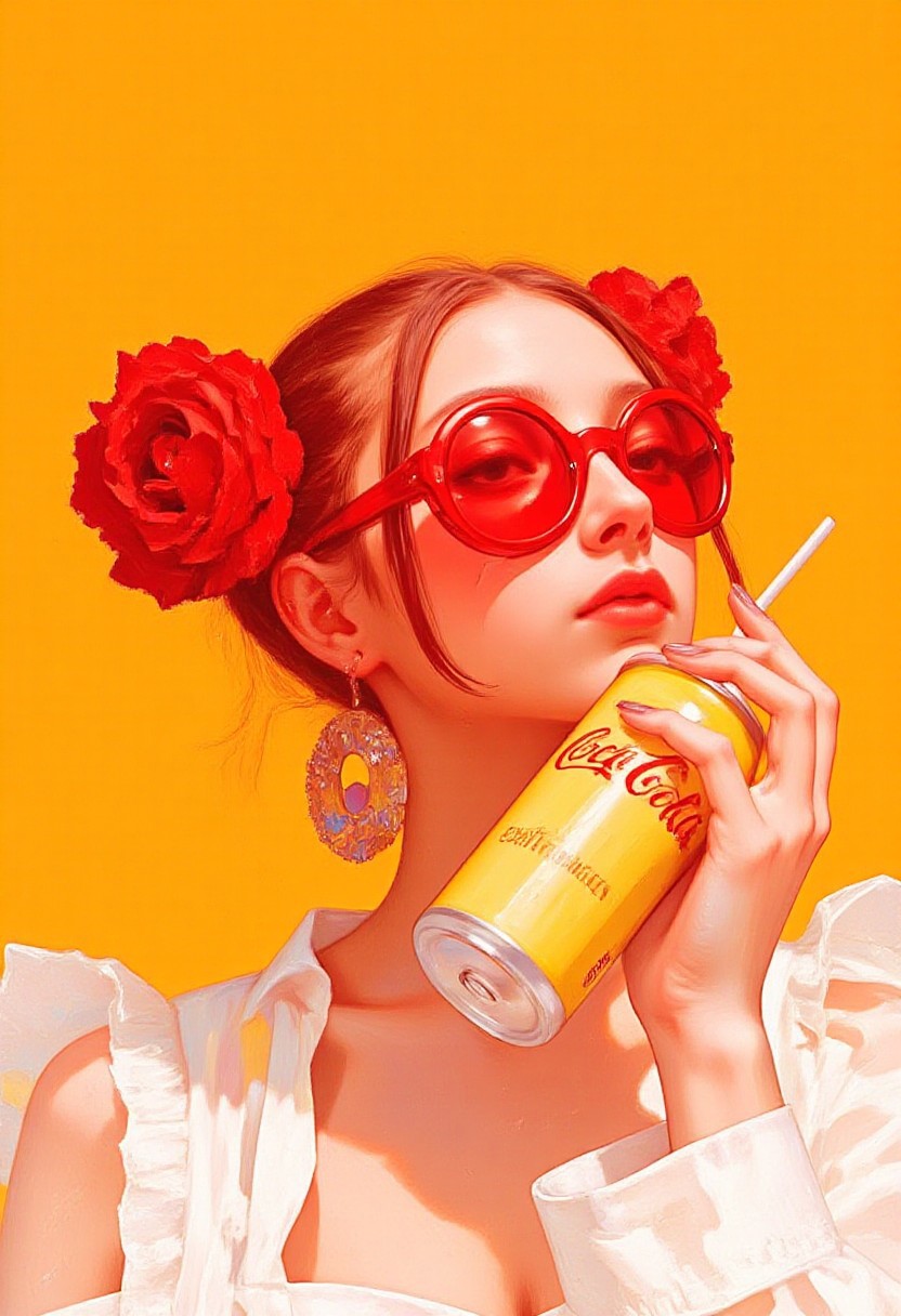 A close-up hyper-realistic portrait of a young woman with vibrant red skin, creating an intense and striking visual presence. Her face is adorned with oversized, round, red sunglasses that completely cover her eyes, adding a mysterious and alluring quality. Her hair is styled in two high buns, each intricately decorated with a large, detailed rose. She wears large, red, round earrings that match her sunglasses, enhancing the bold color palette. She is dressed in a white, high-collared dress with ruffled sleeves and a pleated bodice, emphasizing her surreal, almost doll-like appearance. In her right hand, raised near her face, she holds a yellow Coca-Cola can, the bright color contrasting sharply against her red skin and complementing the vibrant setting. The background is a solid, vivid yellow, intensifying the composition's bold and modern aesthetic. The lighting is even and shadowless, highlighting the flawless, smooth texture of her skin and the polished surface of the digital medium. The overall style blends avant-garde fashion with surrealism, focusing on color contrast, texture, and hyper-realistic detail. (xijie_blue, illustrated, aesthetic_pos3, dynamic_pos3)
