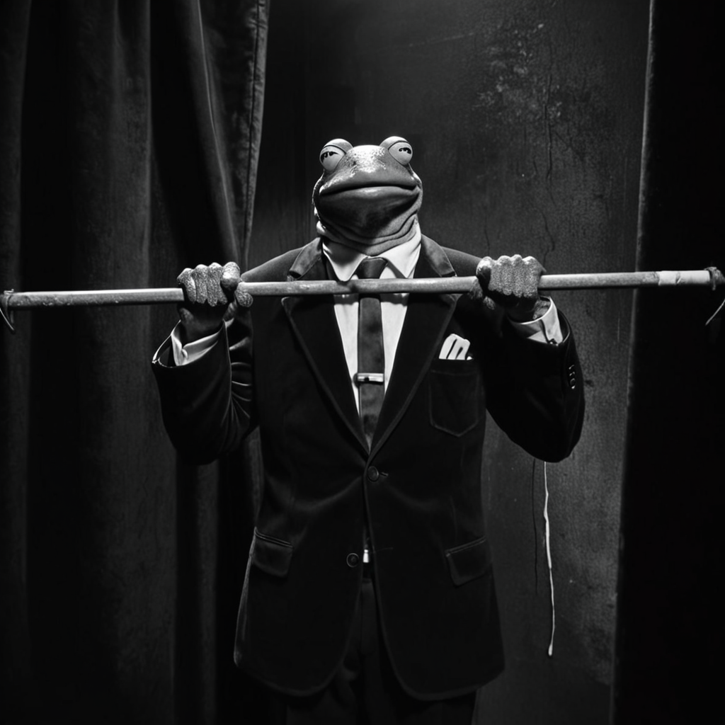 3h3dstyl, a salaryman body grasping a horizontal metal bar with both hands; a surreal humanoid creature with a reptilian head emerging from the collar of a headless man's body who is wearing suit and tie, Lara Croft's skin is slick and rubbery, reflecting the dim studio lighting; it stands against a black velvet curtain backdrop, creating an eerie stage-like setting, with uncanny, dreamlike tension in the air <lora:Eraserhead Style SDXL_v1:0.8> 3h3dstyl,monochrome, Kermit the Frog in dark vintage clothing sits rigidly beside an old gas stove, a cigarette clamped between pursed lips; stark overhead lighting casts deep shadows on the cracked kitchen wall behind her, evoking a mood of eerie domestic stillness <lora:Eraserhead_Style_SDXL:0.8>