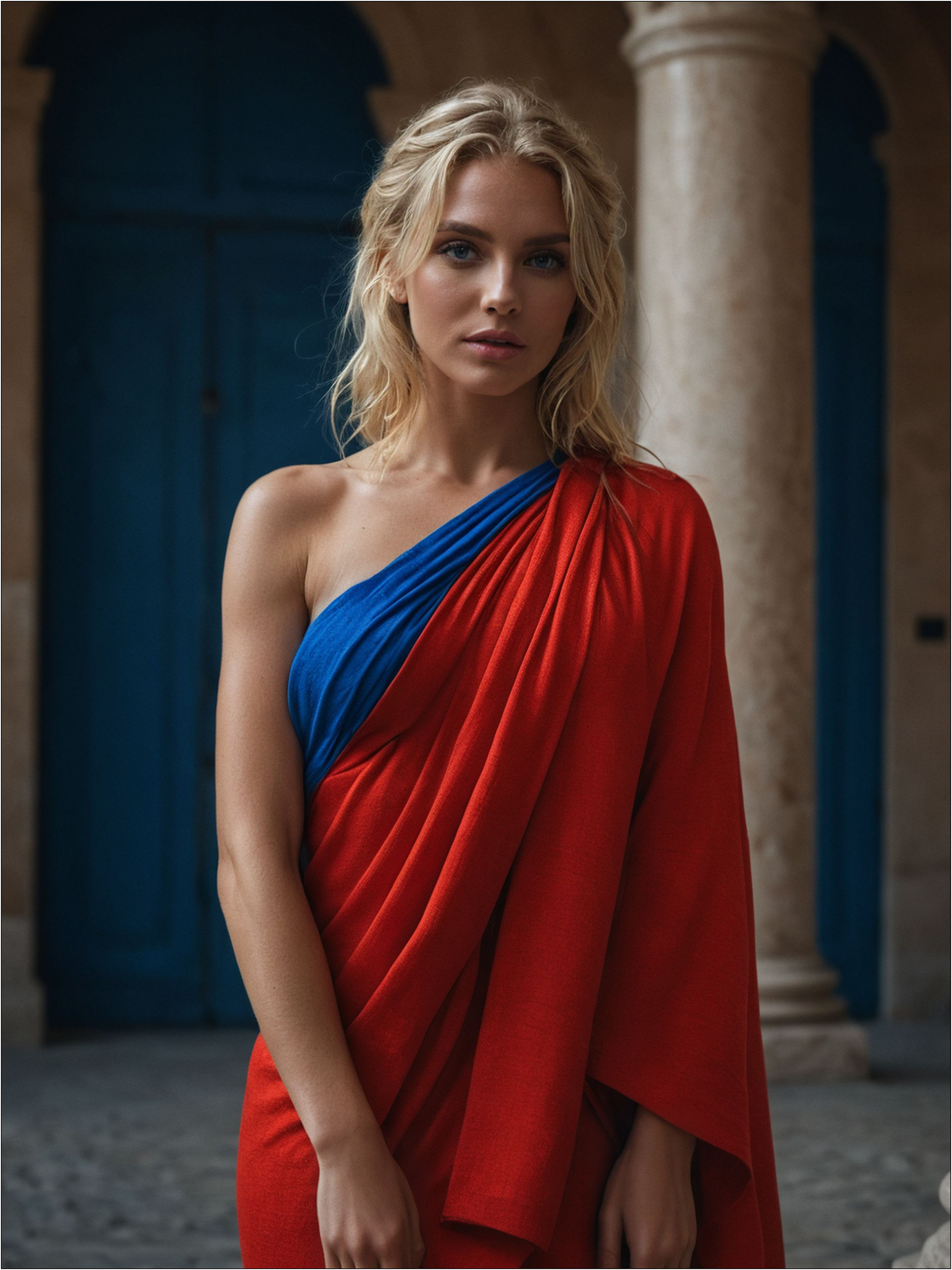 (full body shot:1.4), in a (red and blue toga barely covering body) <lora:Taylor_XL:0.6>, (striking features, Swedish model, beauty, intricate details, dramatic composition, blonde hair, perfect eyes, highly detailed beautiful expressive eyes, texture, Rome, 35mm photograph, film, bokeh, professional, 4k, highly detailed dynamic lighting, photorealistic, 8k, raw, rich, intricate details, key visual, vivid colors <lora:Perfect Hands:0.6>, <lora:RMSDXL_Enhance:1>