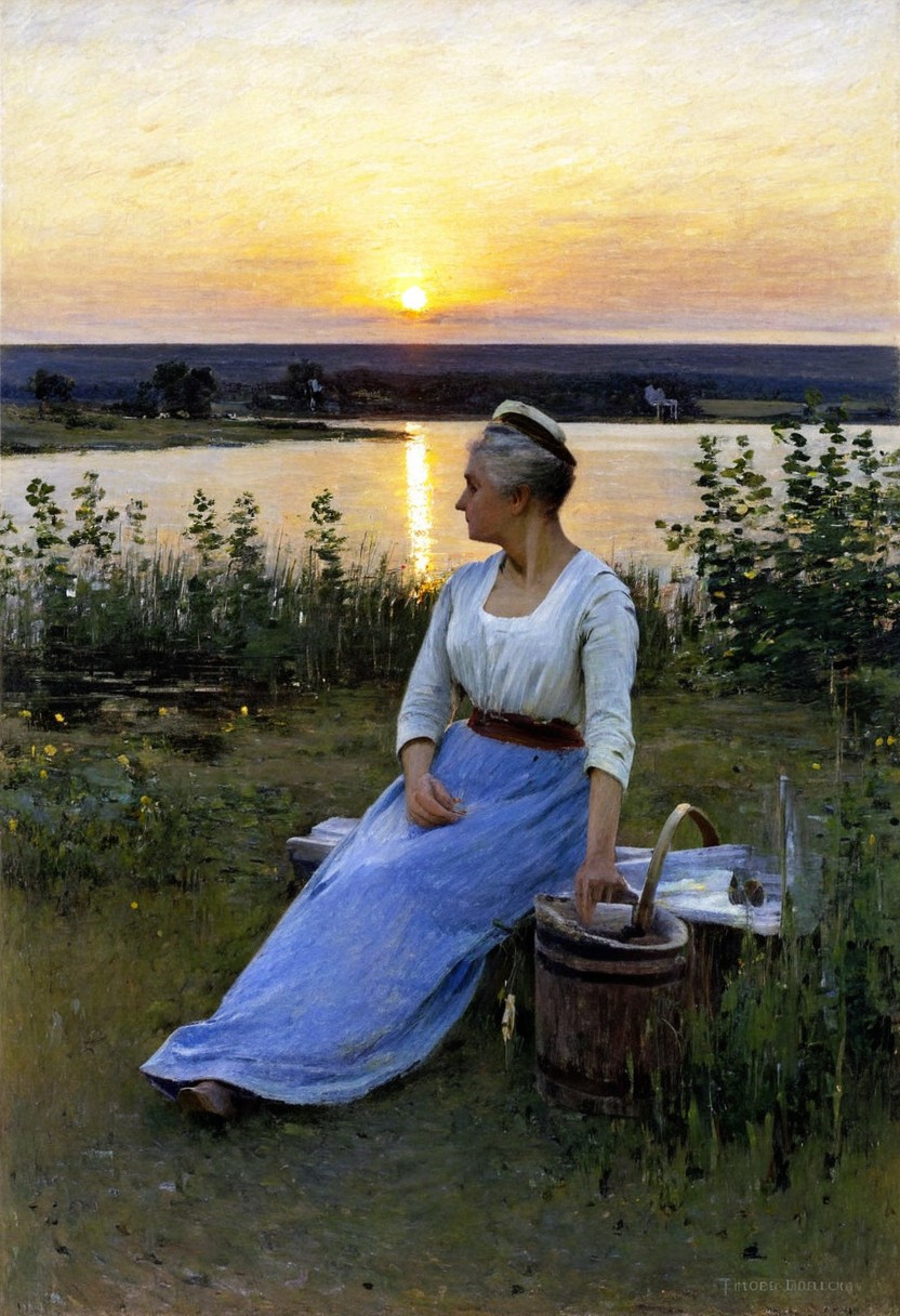 sunset, northern lake, summer, old fashioned woman, nostalgic, high quality, detailed, 1girl, scenery, by theodore robinson, impressionism, painting