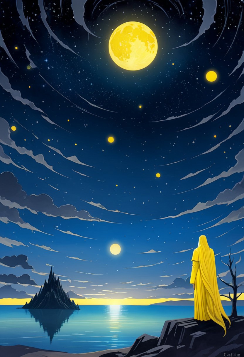 Along the shore the cloud waves break The twin suns sink behind the lake The shadows lengthen In Carcosa Strange is the night where black stars rise And strange moons circle through the skies But stranger still is Lost Carcosa Songs that the Hyades shall sing Where flap the tatters of the King Must die unheard in Dim Carcosa Song of my soul my voice is dead Die thou unsung as tears unshed Shall dry and die in Lost Carcosa, Hastur, cosmic horror, dark art, King in Yellow, by bernard cathelin