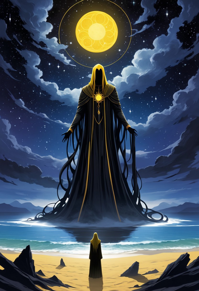 Along the shore the cloud waves break The twin suns sink behind the lake The shadows lengthen In Carcosa Strange is the night where black stars rise And strange moons circle through the skies But stranger still is Lost Carcosa Songs that the Hyades shall sing Where flap the tatters of the King Must die unheard in Dim Carcosa Song of my soul my voice is dead Die thou unsung as tears unshed Shall dry and die in Lost Carcosa, Hastur, cosmic horror, dark art, King in Yellow, by bernard cathelin