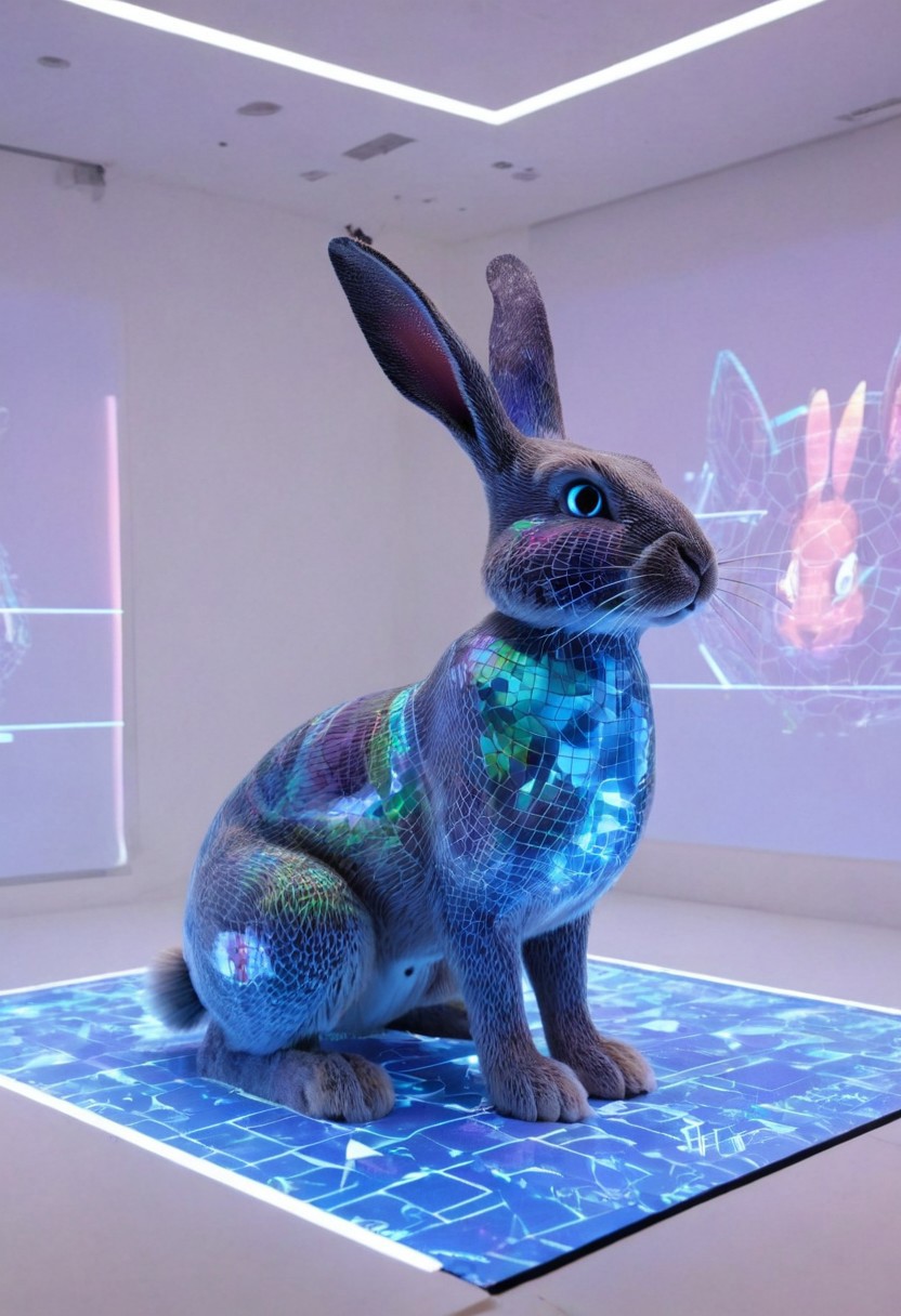 A product photo of a futuristic product of a holographic projection with a blue tint, its a projection a fuffly rabbit in a huge projection, it's in a blank white room. Most of the lighting is from the projection.