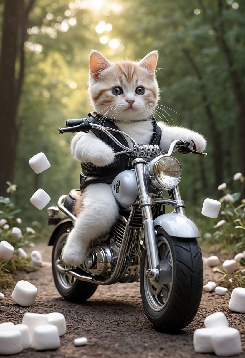 (((score_9, Score_8_up, score_7_up))), Cute kitten, riding motorcycle, marshmallows atmosphere,