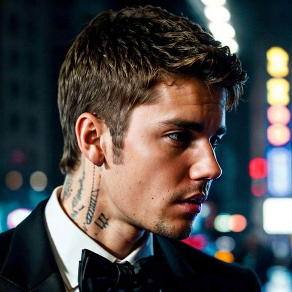 DSLR photo of justinbieber person using a tuxedo.face side portrait.in blade runner.daylight.professional photography.high resolution.detailed photo.RAW.still film.f/16.uhd.hdr.4k <lora:justinbieber_77400:1>