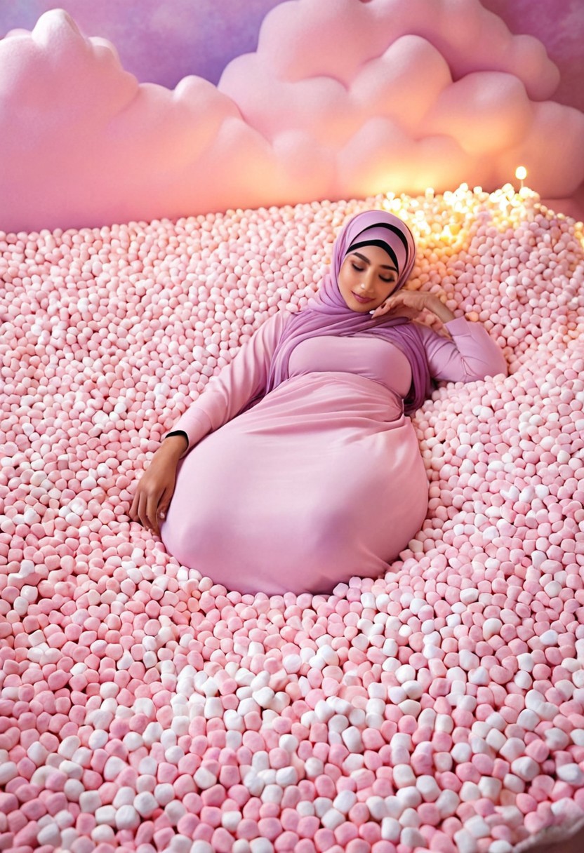 (((reality-shot, realism, realistic photography of a hijabi woman lounging in a ballpit filled with marshmallows, her elegant hijab draped softly as she leans back on a mound of sugary puffs, soft pastel lighting casting a dreamy glow over the scene, marshmallows shimmering like clouds beneath her, serene art style, lavender-cream theme, intricate details, ultra sharp, exquisite detail, flawless composition, vivid colors, masterpiece, tranquil indulgence lora:world_marshmallows:1 )))