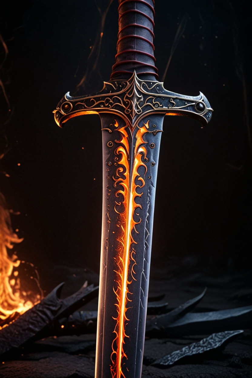 HavvoricFireDarkstyle, close up of sword, cinematic photography <lora:HavvoricFireDarkstyle:1>