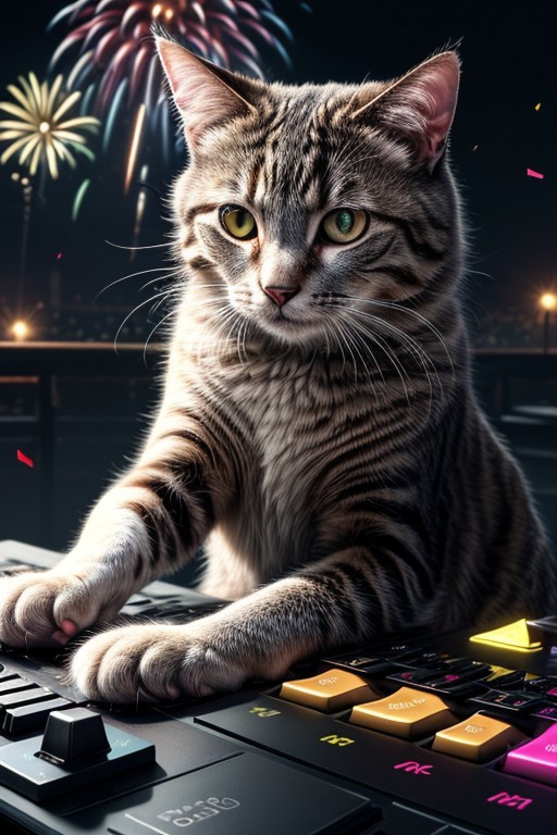 (masterpiece:1.2), (best quality:1.2), highly detailed, realistic texture, sharp details, extremely delicate and beautiful, realistic cg 8k wallpaper Cat DJ with RGB paws, spinning tunes with keyboards, confetti and fireworks <lora:add-detail-xl:3> <lora:RGB_Keyboard_themed:1>