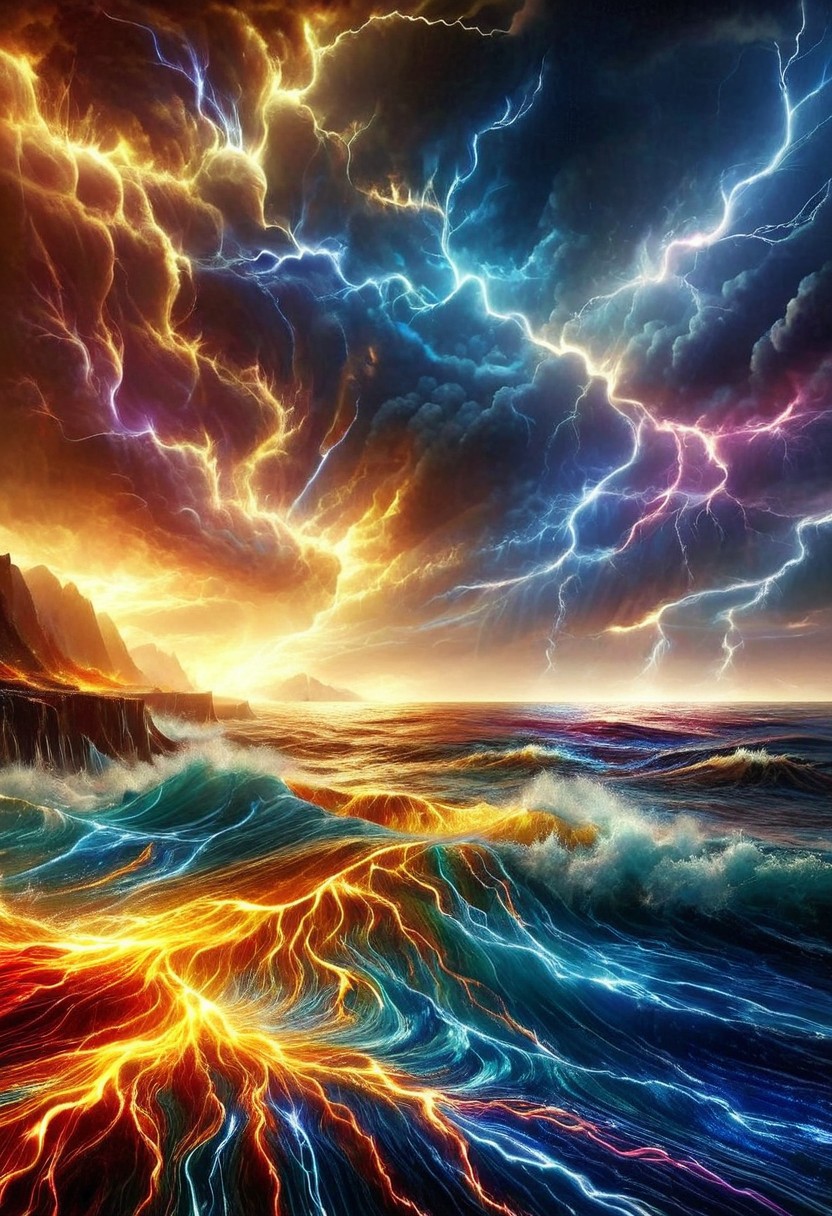(((reality-shot, realism, realistic photography of a dramatic stormy seascape infused with electrified energy, waves crashing against jagged cliffs coated in glowing plasma textures, lightning bolts striking electrified clouds, dark skies swirling overhead with hints of chromatic flashes, dramatic art style, charcoal-electric theme, intricate details, ultra sharp, exquisite detail, flawless composition, vivid colors, masterpiece, turbulent intensity lora:electrify_world:1 ))) made of golden and blue and red and yellow and purple lightning thunder trails , lthndrtrl