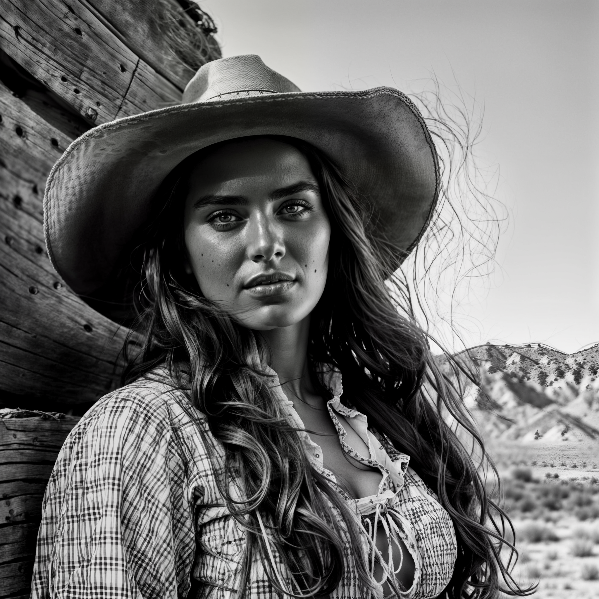 RAW, photorealistic, best_quality, cowboy-shot of a good looking woman in the western american frontier, year 1860, mediterranean face features, the style of Ansel Adams