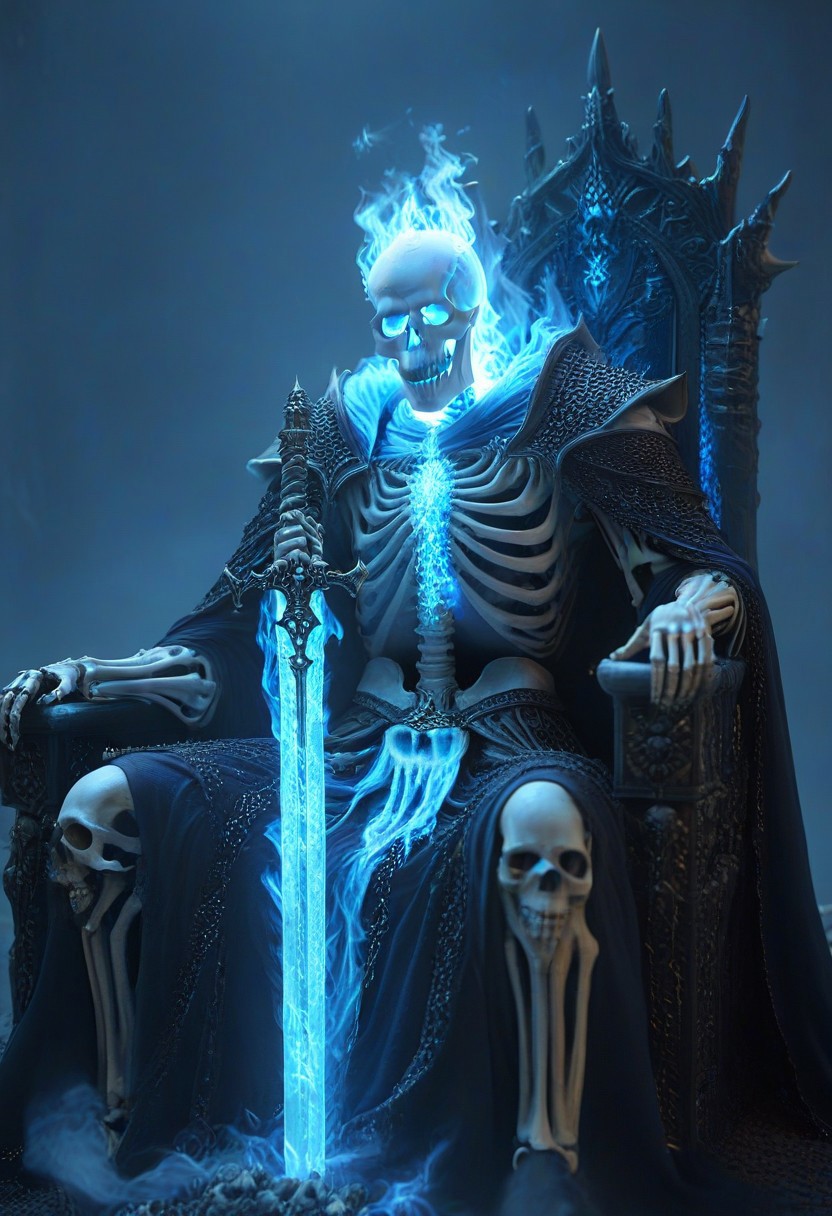 Dark wizard skeleton, blue flaming skull head, skeleton, wearing a robe covering the head, half of his body is a skeleton, the darkness aura is very strong, sitting on the throne, holding a scepter full of magic energy, the color of the darkness aura is a combination of blue and dark, evil palace, throne, tattered clothes, very detailed, <lora:aidma-Image Upgrader-v0.1:1>